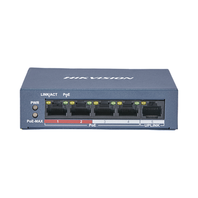 El Hikvision DS-3E0105P-E/M(B) es un switch PoE no administrable diseñado para instalaciones de videovigilancia y redes pequeñas que requieren alimentación y conectividad confiable. Con 4 puertos PoE y 1 puerto uplink, permite conectar y alimentar cámaras IP y otros dispositivos compatibles mediante un solo cable Ethernet, simplificando la instalación y reduciendo costos.