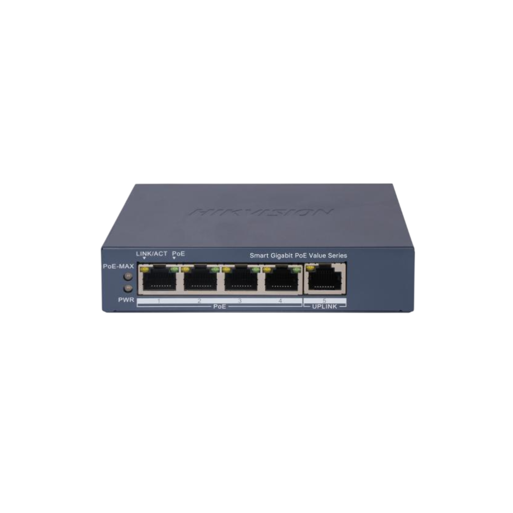 El switch PoE Hikvision DS-3E1505P-EI/M permite conectar y alimentar cámaras y dispositivos de red con 5 puertos Gigabit, ofreciendo conectividad rápida, estable y confiable para hogares y oficinas.